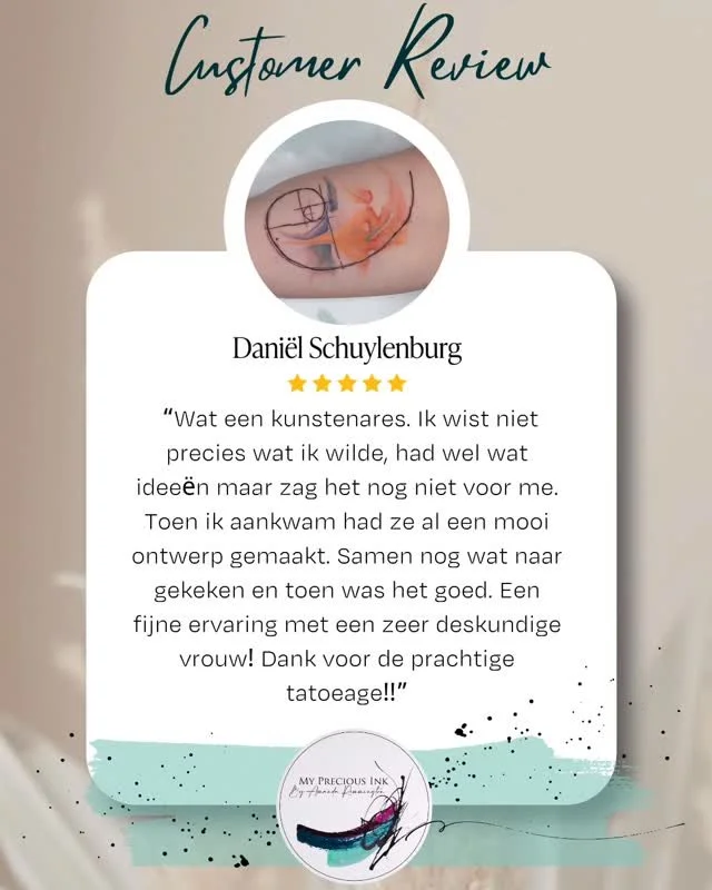 Bij My Precious Ink werken we samen als een hecht team om je de best mogelijke ervaring te bieden. Van het eerste mailcontact tot aan de afspraken en de grote dag zelf, we zorgen ervoor dat alles soepel verloopt en jij je volledig op je gemak voelt.